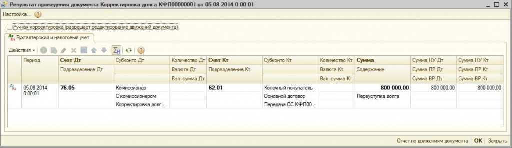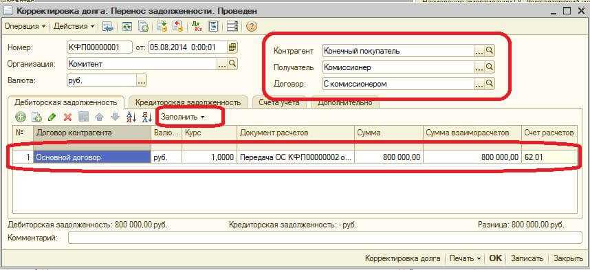 В результате проведения документа, задолженность от реализации ОС будет перенесена на комиссионера: