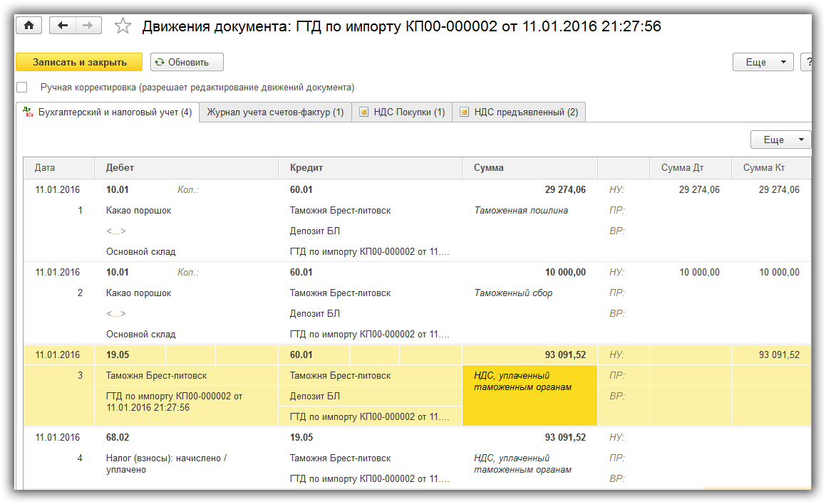 Видно что система отнесла таможенный сбор и пошлину на себестоимости товара (в нашем случае материала) и учла суммы НДС.