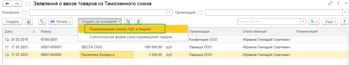 Или подтверждение можно сформировать на основании Заявления о ввозе товаров