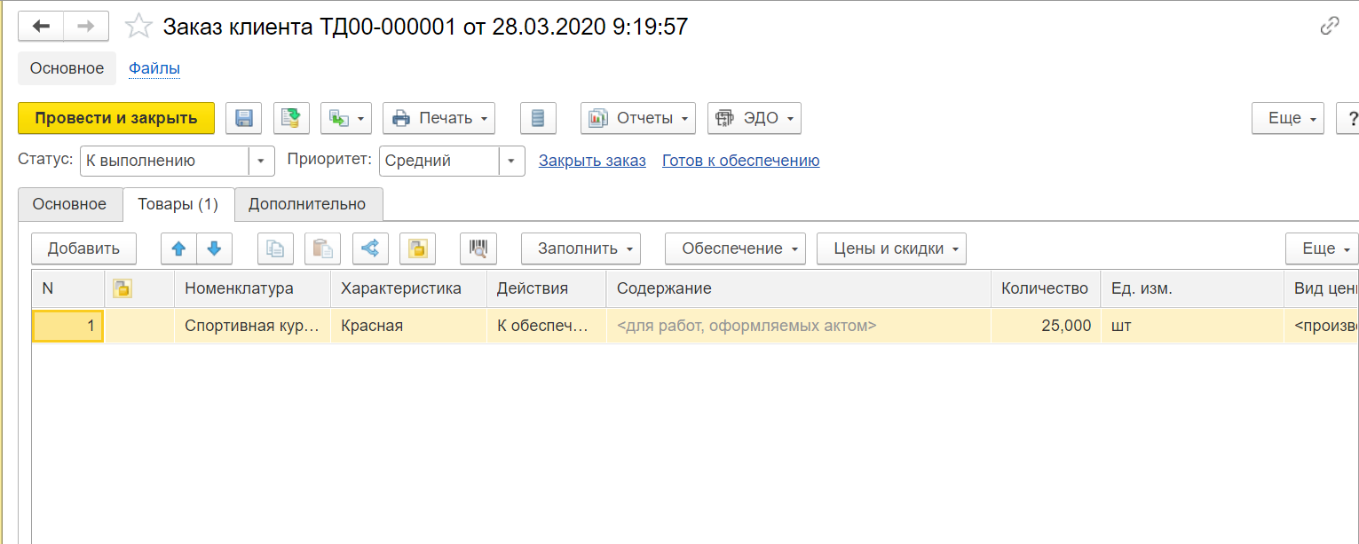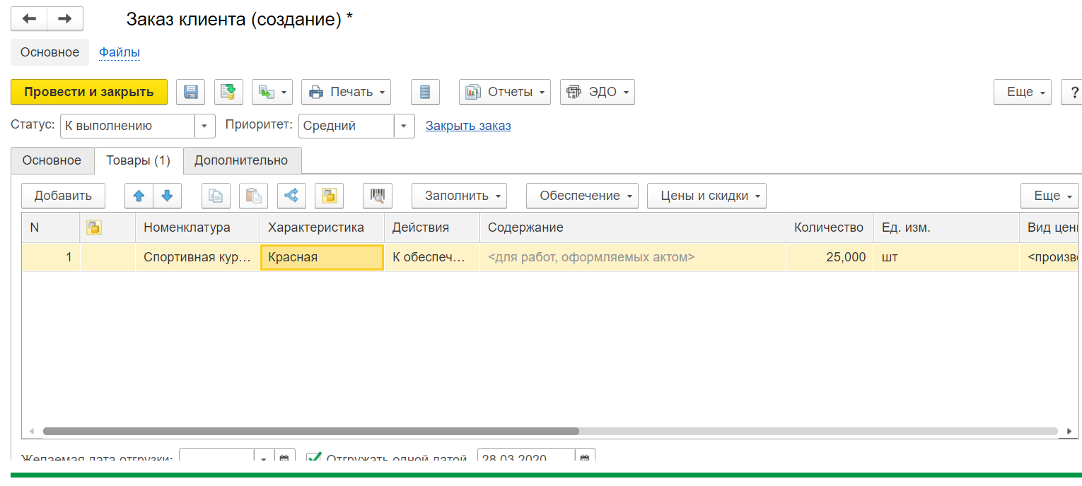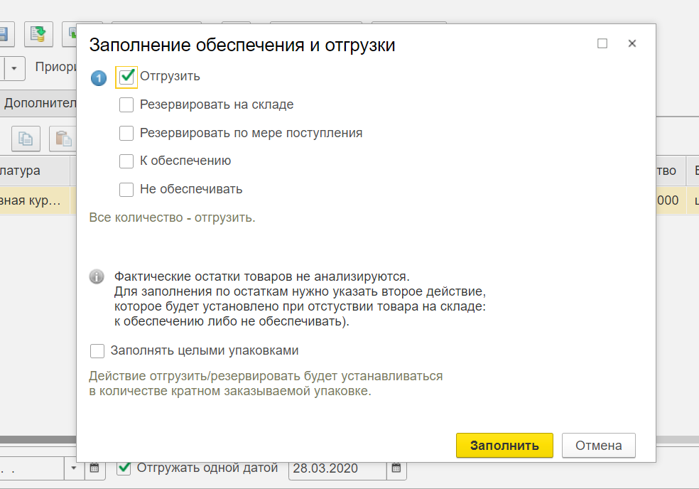Обратите внимание: для того чтобы отгрузить заказ, необходимо изменить статус в форме заказа. Выберите статус «К выполнению», после чего нажмите на кнопку «Обеспечение» – «Заполнить обеспечение» – «Отгрузить».