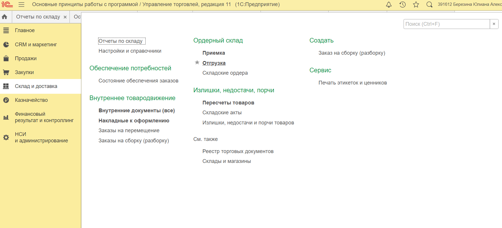 Следующий шаг – выписка ордера на отгрузку заказа. Перейдите в раздел «Склад и доставка» – Ордерный склад» – «Отгрузка».