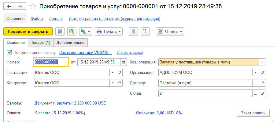 Если вернуться к базовой схеме, то мы ее отразили с помощью двух оформленных документов в 1С: оформление заказа поставщику и приобретение товаров и услуг.