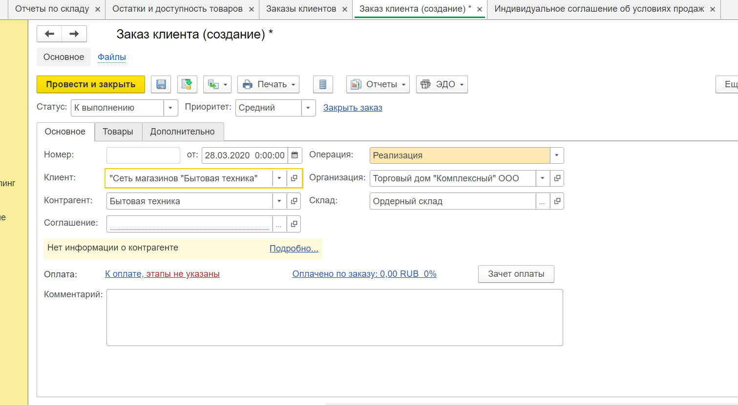 Создадим документ «Заказ клиента». Видим, что в 1С доступно два статуса заказа покупателя «К выполнению» и «На согласовании». Первый используется, если заказ точно подтвержден, второй – в случае, если покупатель может внести какие-либо изменения (например, по срокам доставки, количеству наименований и др.).