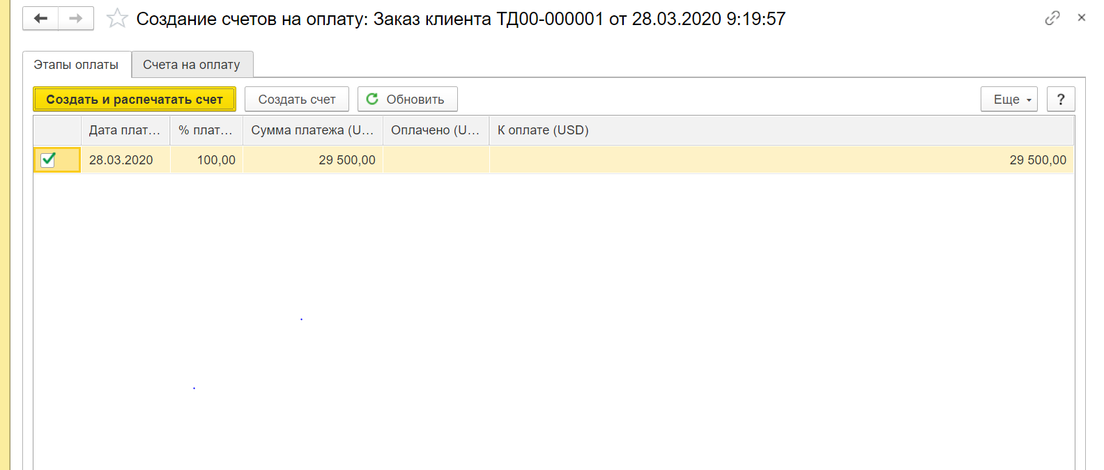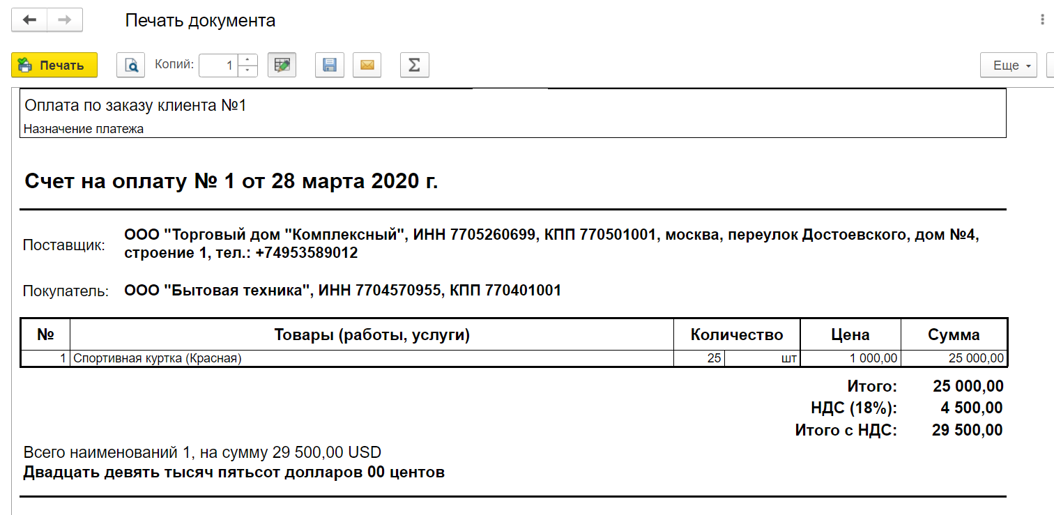 После того как заказ покупателя создан, зарегистрируем на его основании счет на оплату. Сделать это можно прямо из формы заказа, кликнув на опцию «Создать на основании». После проведения документа вы сможете как отправить счет по электронной почте, так и распечатать его.