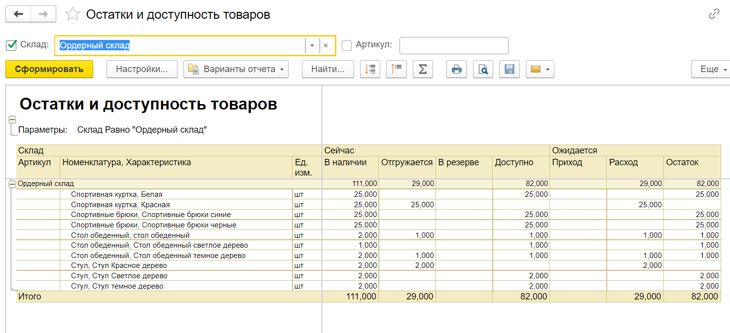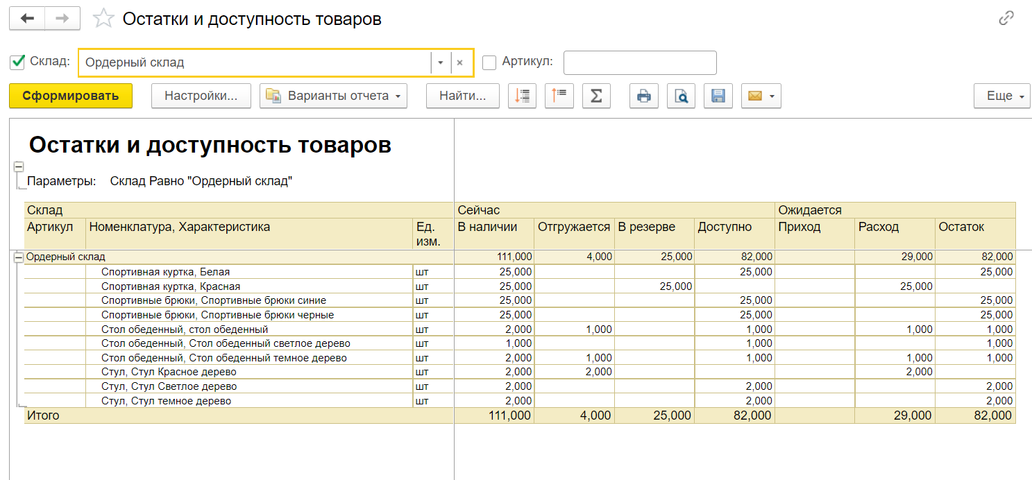 Для того чтобы убедиться в том, что нужные позиции зарезервированы на складе, повторно сформируем отчет «Остатки и доступность товаров». Видно, что на текущую дату на складе доступно 25 наименований «Спортивная куртка красная», 25 из которых зарезервированы на складе.
