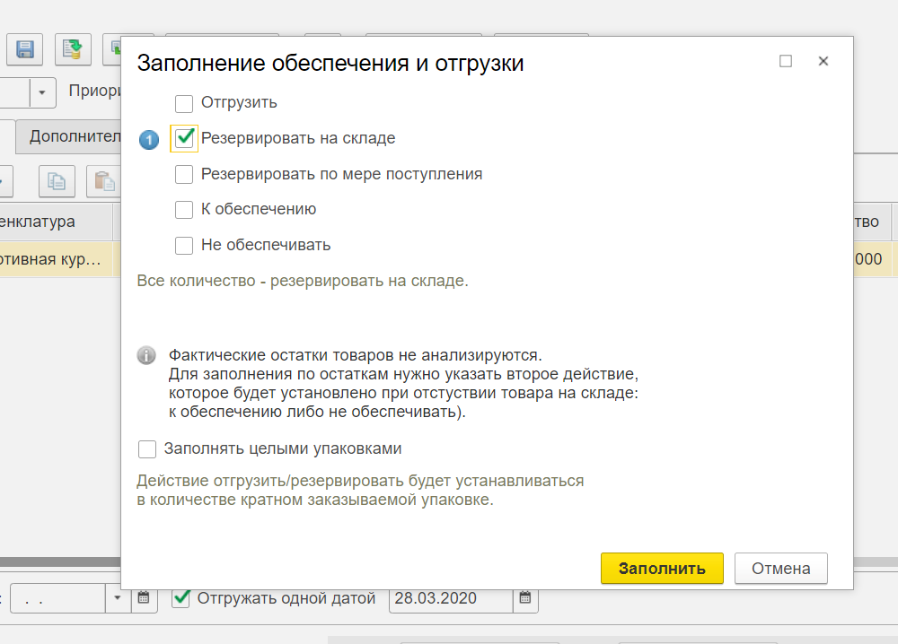В открывшейся форме отметьте галочкой чек-бокс «Резервировать на складе» и нажмите кнопку «Заполнить». Все данные будут перенесены автоматически.