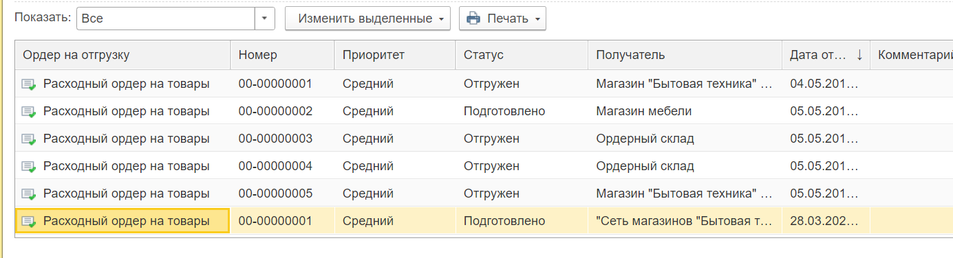 Отгрузка товара (переход в статус отгруженных) |