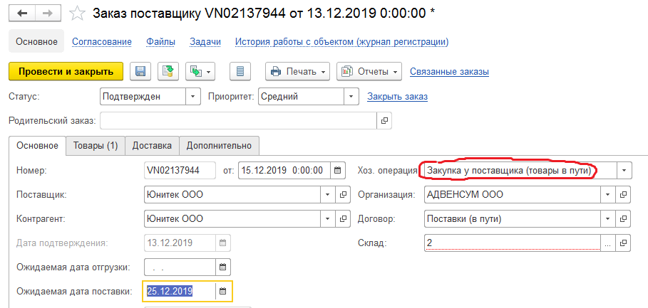 Принципиальная схема очень проста. Предположим, товар был приобретен 15 декабря 2019 года на условиях «Самовывоз со склада поставщика», но на склад предприятия еще не поступил (по плану 25 декабря 2019 года). Этот пример и будем рассматривать с использованием «1С:ERP 2.4»