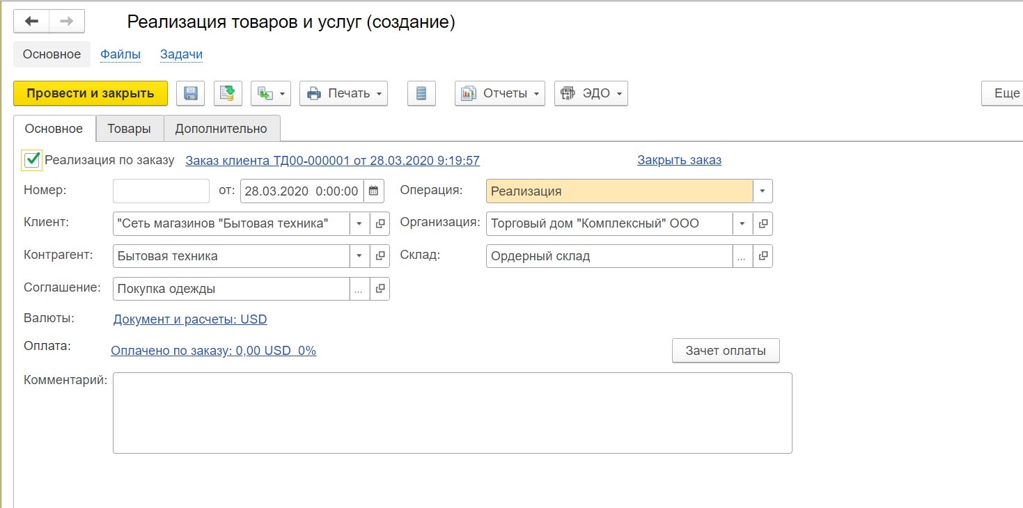 Создать форму можно на основании заказа покупателя. В открывшейся форме измените данные, выберите склад и нажмите на кнопку «Записать и провести».