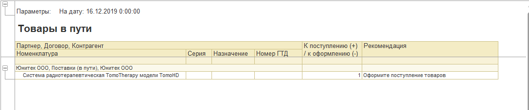 К недостатку отображения схемы «Товары в пути» можно отнести то обстоятельство, что отображается только факт того, что на определенный момент времени, такой-то товар (в разрезе поставщиков и договоров) находится где-то «в пути», а не на складе. Установить, в какой точке маршрута следования он находится, не представляется возможным.