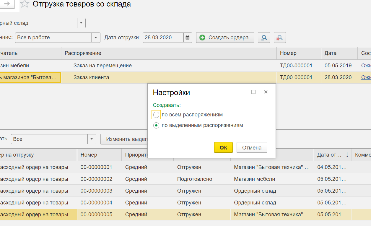 На вкладке «Заказ» выберите заказ клиента, после чего нажмите на вкладку «Создать ордера». В открывшемся диалоговом окне выберите «По выделенным распоряжениям» и нажмите кнопку «ОК».