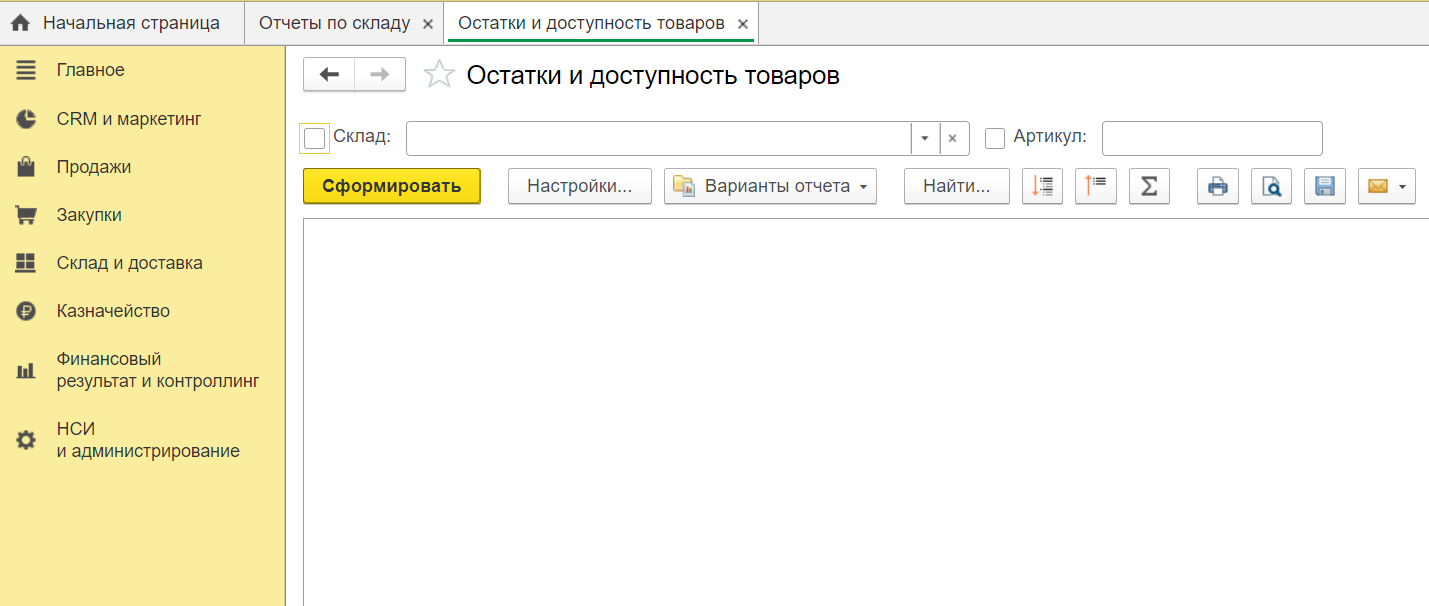 В первую очередь, необходимо проверить остатки номенклатуры на складе. Для этого перейдём в раздел «Склады и доставка» – «Отчеты по складу» и формируем аналитическую ведомость «Остатки и доступность товаров».