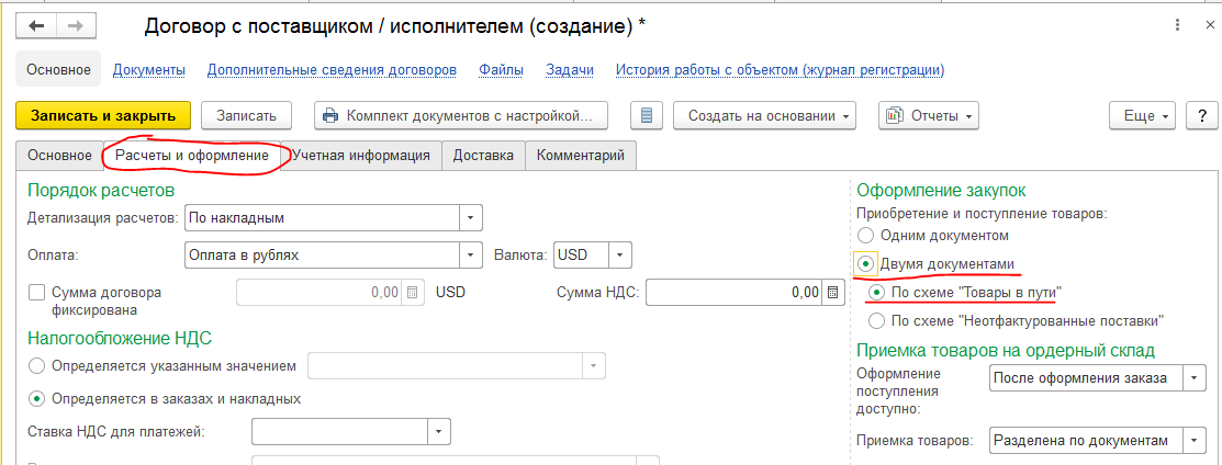 Договор с поставщиком, который желательно оформлять в рамочных документах, на вкладке «Расчет и оформление» на вкладке «Оформление закупок». Обязательно установить переключатели в положение «Двумя документами» и по схеме «Товары в пути 1С», как это показано на скриншоте.