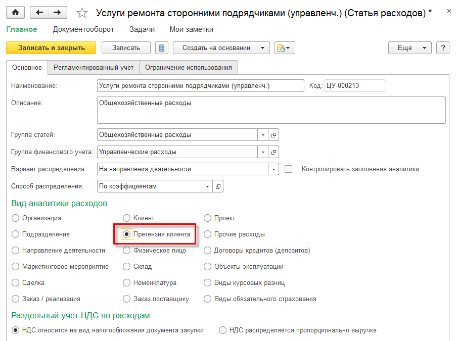 Допустим, в статье затрат указан вид аналитики Претензия клиента и способ распределения на направление деятельности Гарантийный ремонт. Пользователь формирует общую стоимость затрат на выполнение гарантийного ремонта с детализацией по себестоимости устранения всех поступивших претензий.