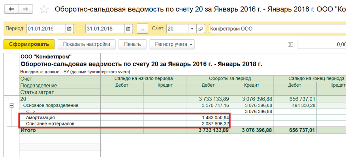Аналогично формируем отчет по счету 20.01. Все обороты программа 1С 8.3 сформировала верно:
